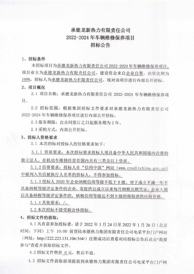 承德龍新熱力有限責(zé)任公司2022-2024年車輛維修保養(yǎng)項(xiàng)目招標(biāo)公告