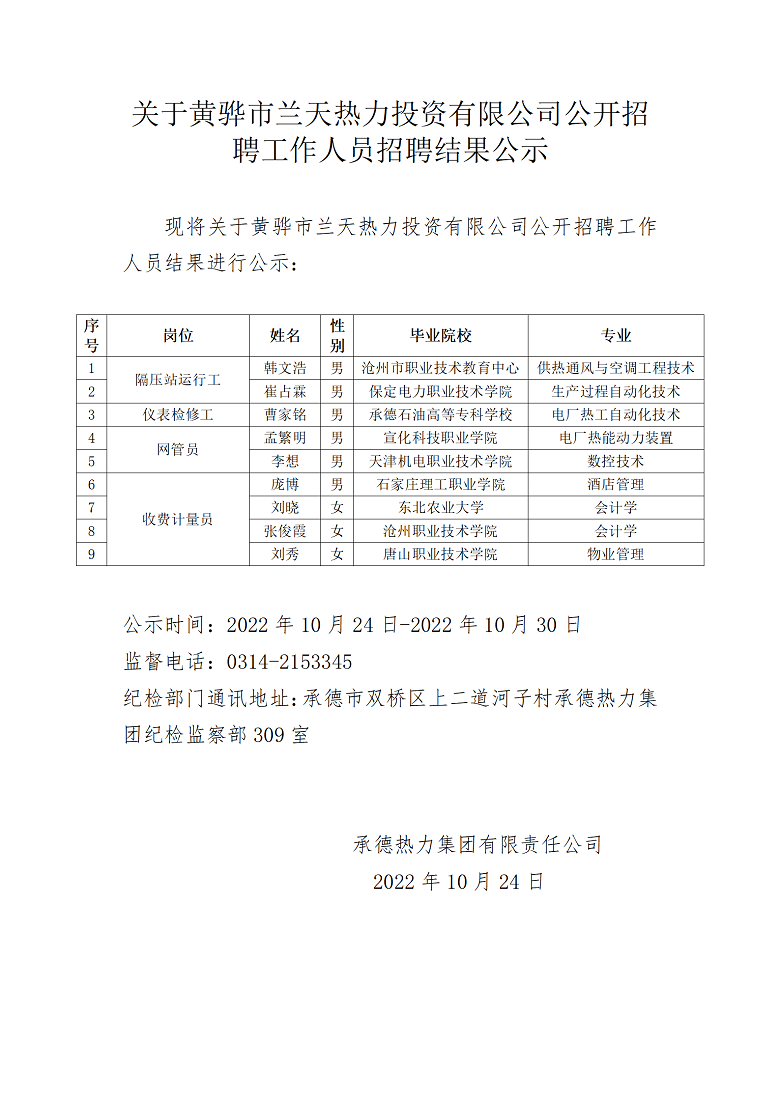 關(guān)于黃驊市蘭天熱力投資有限公司公開招聘工作人員招聘結(jié)果公示