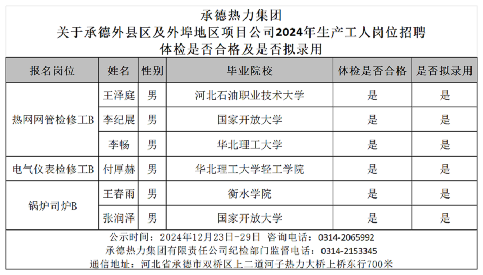 關(guān)于承德外縣區(qū)及外埠地區(qū)項目公司2024年生產(chǎn)工人崗位招聘體檢是否合格及是否擬錄用